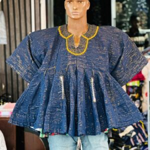 Step into timeless elegance with this breathtaking handcrafted Ghanaian Batakari Smock. Made from premium, breathable cotton fabric, this authentic piece showcases a deep navy blue base beautifully accented by vibrant yellow and subtle textured stripes that catch the light with every movement.