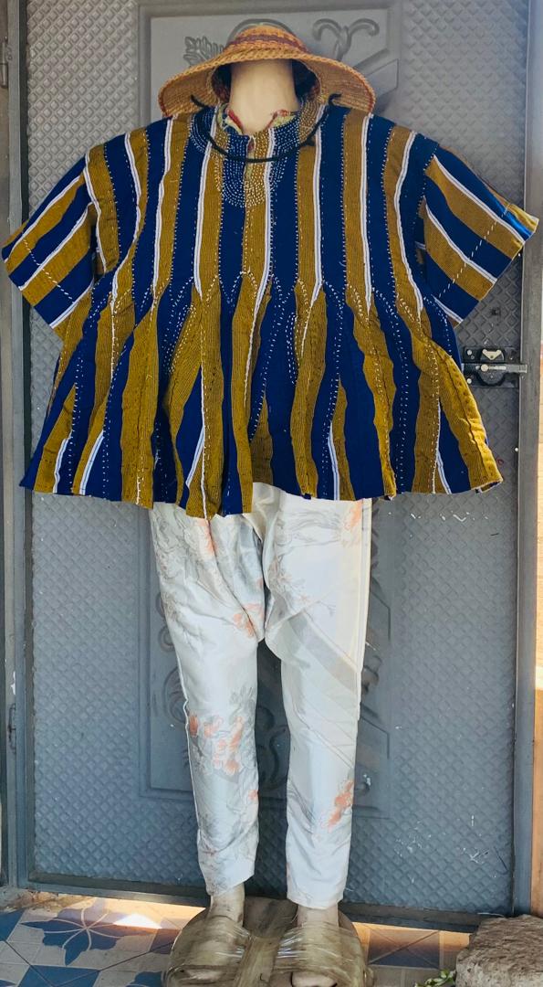 Bold, beautiful, and bursting with heritage – this royal blue and gold striped batakari smock is a true showstopper. Hand-embroidered neckline, flowing wide sleeves, and a graceful flared hem create an effortlessly elegant look that celebrates Ghanaian craftsmanship with modern flair.